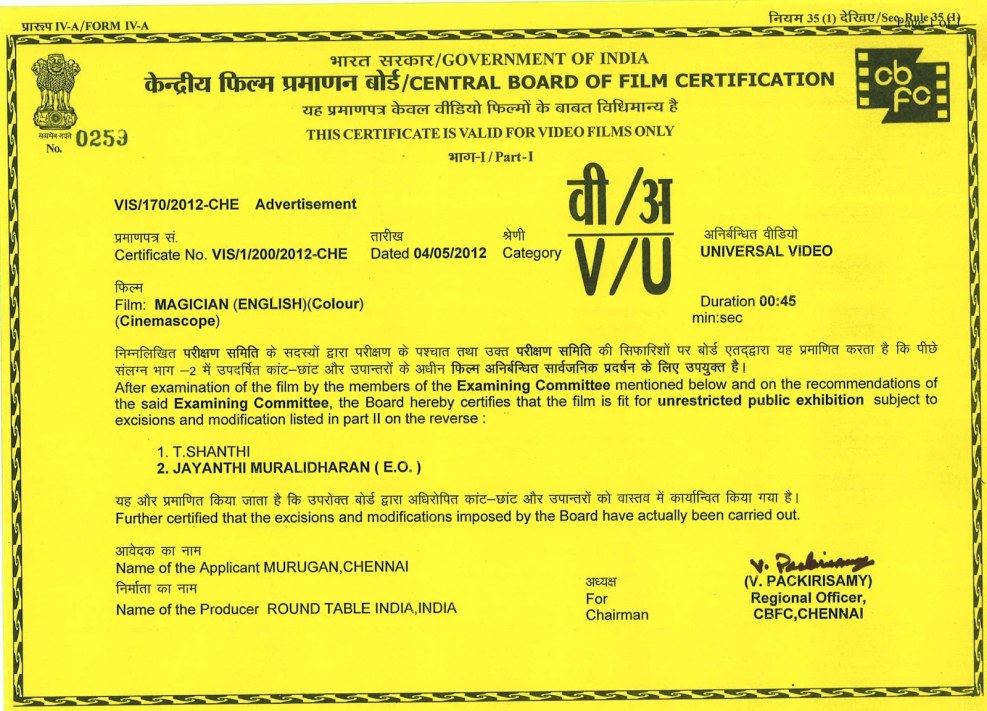 Certification of the film