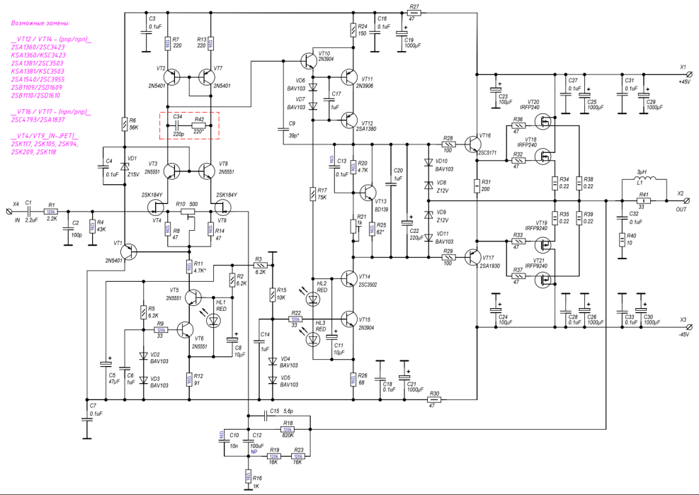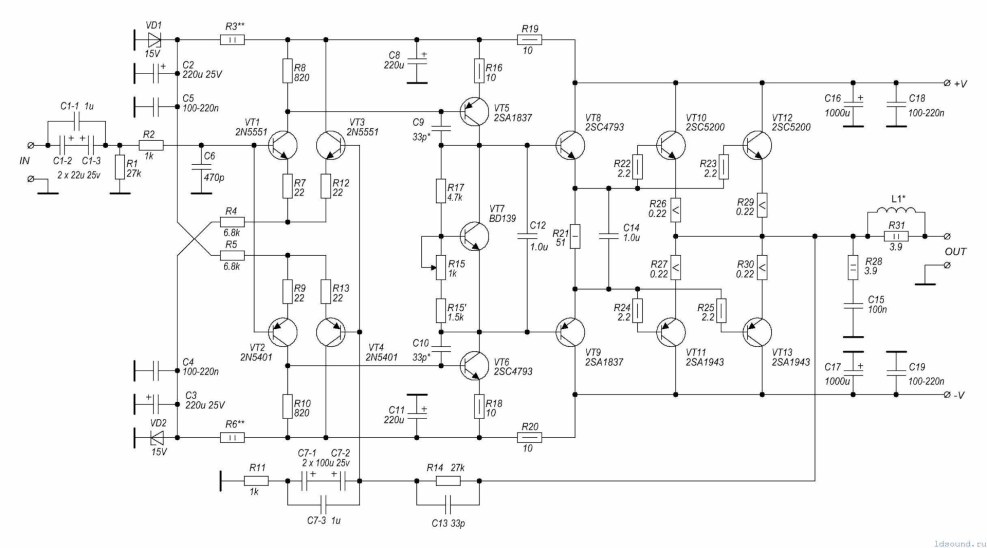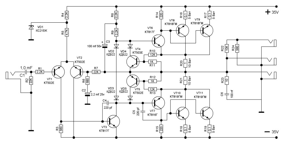 Amplifier on transistors KT818 KT819 Scheme