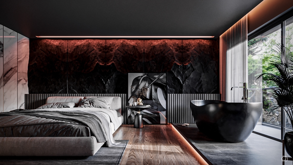 The bedroom in a country house in a modern style in dark colors