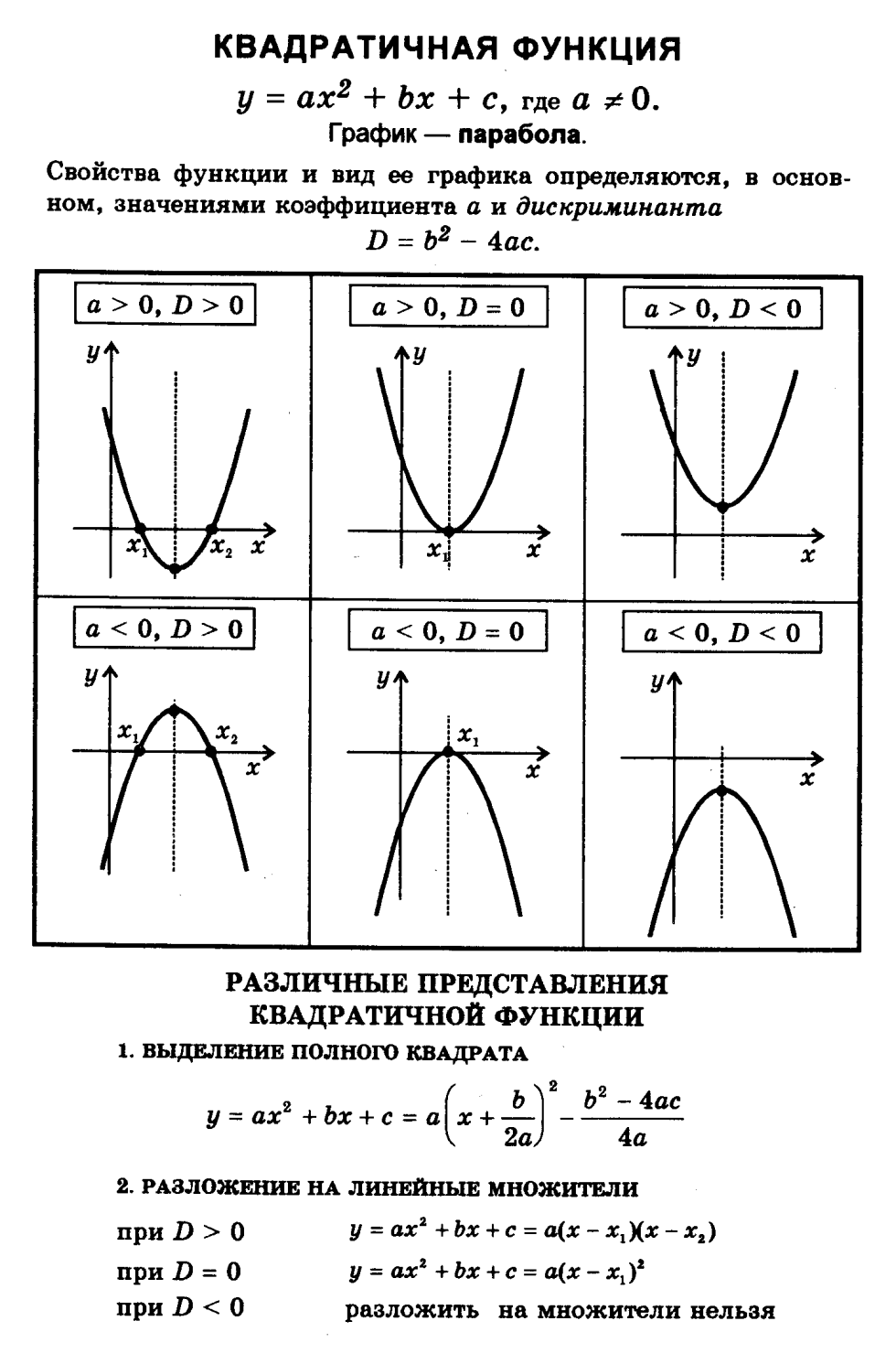 Schedule of quadratic function depending on the coefficients
