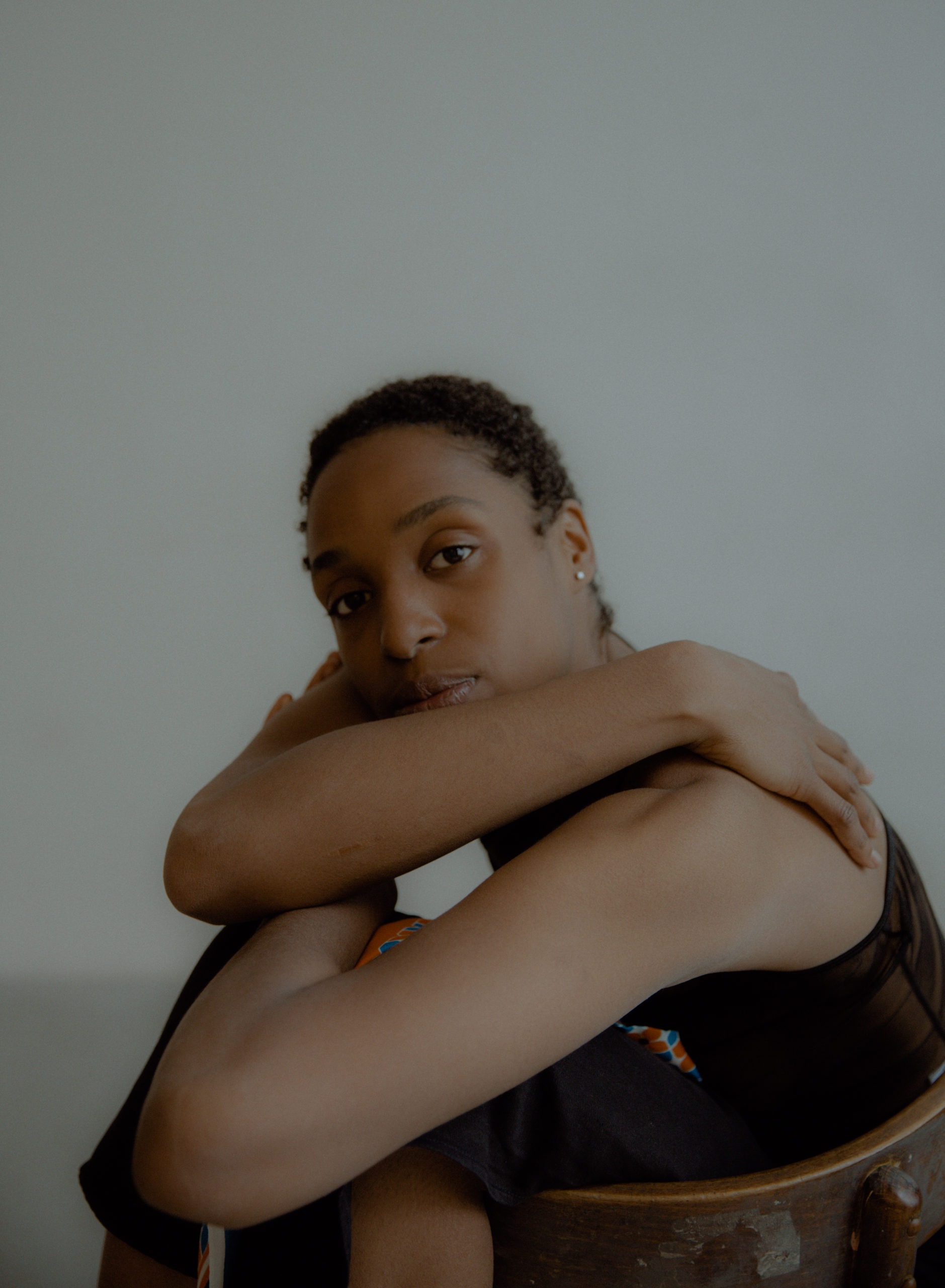 Naked blonde sitting in a chair