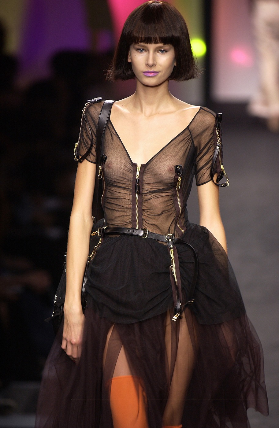 Shalom Harlow with bare breasts at a fashion show